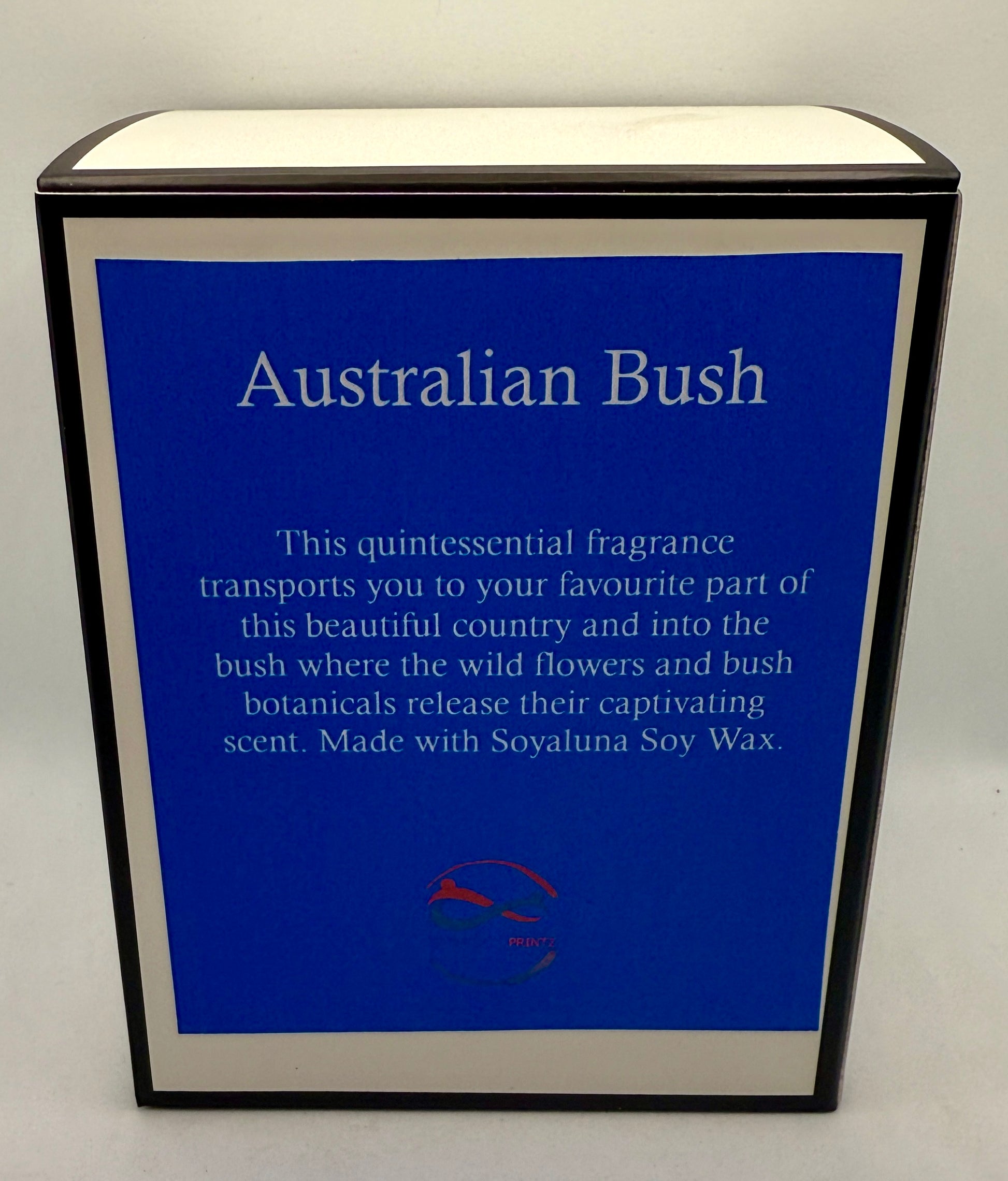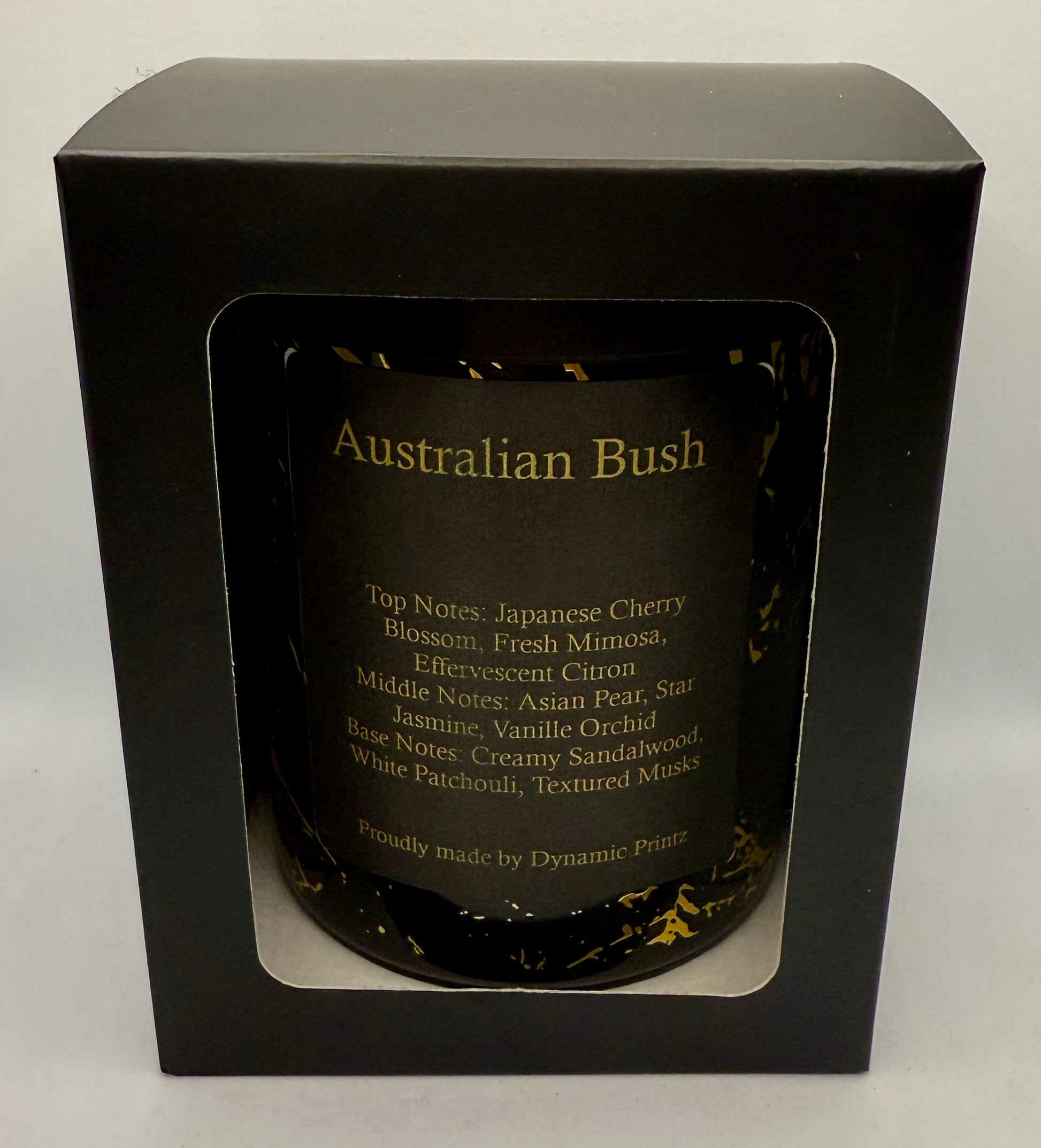 285g scented candle in a beautiful marbled jar. Quintessential Australian Bush fragrance, this fragrance transports you to your favourite part of this beautiful country and into the bush where the wild flowers and bush botanicals release their captivating scent.