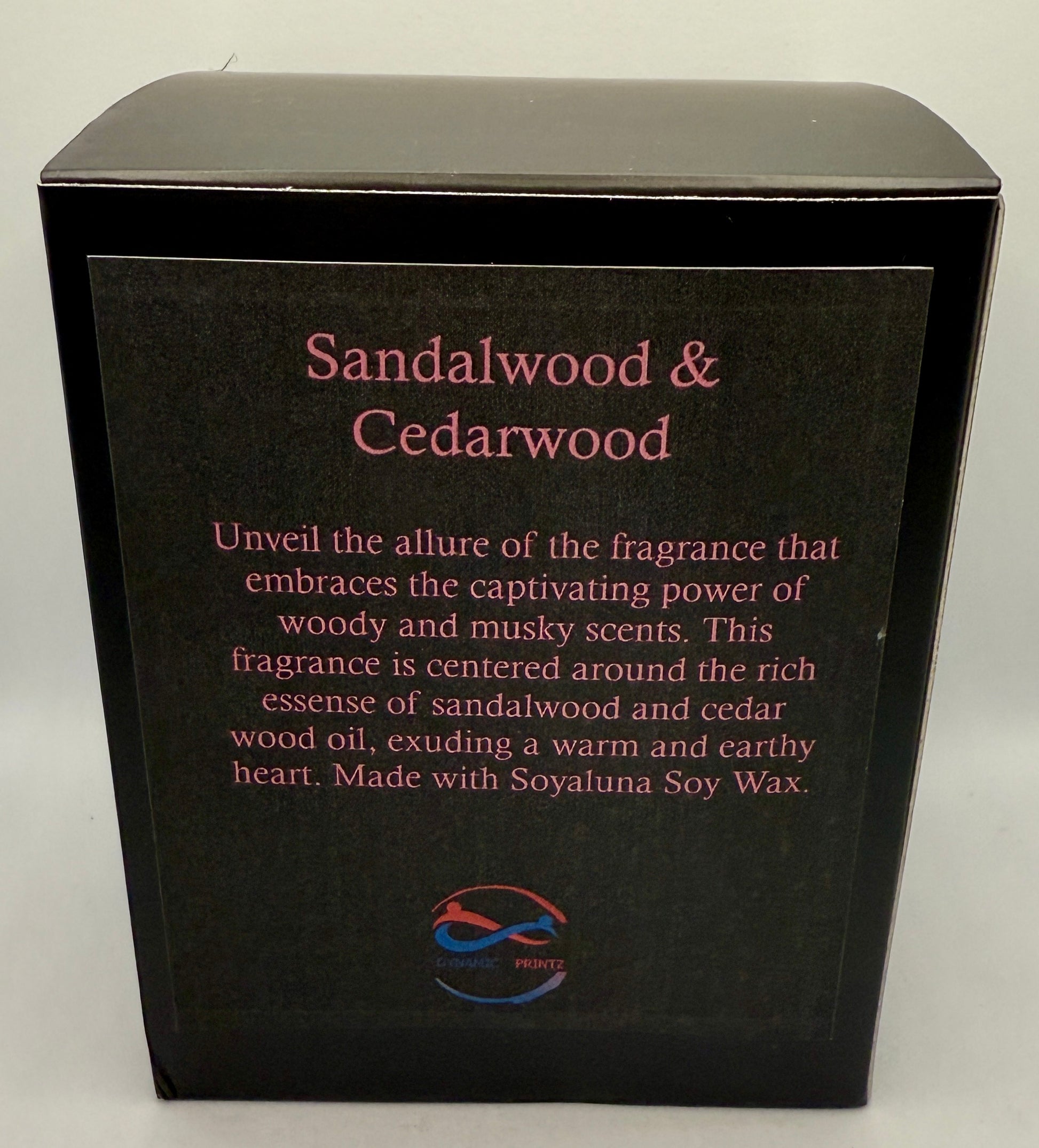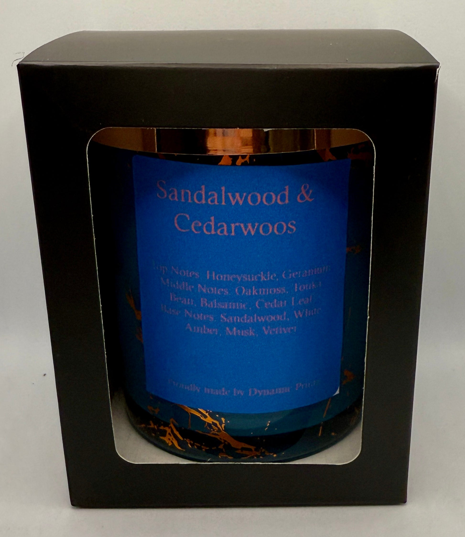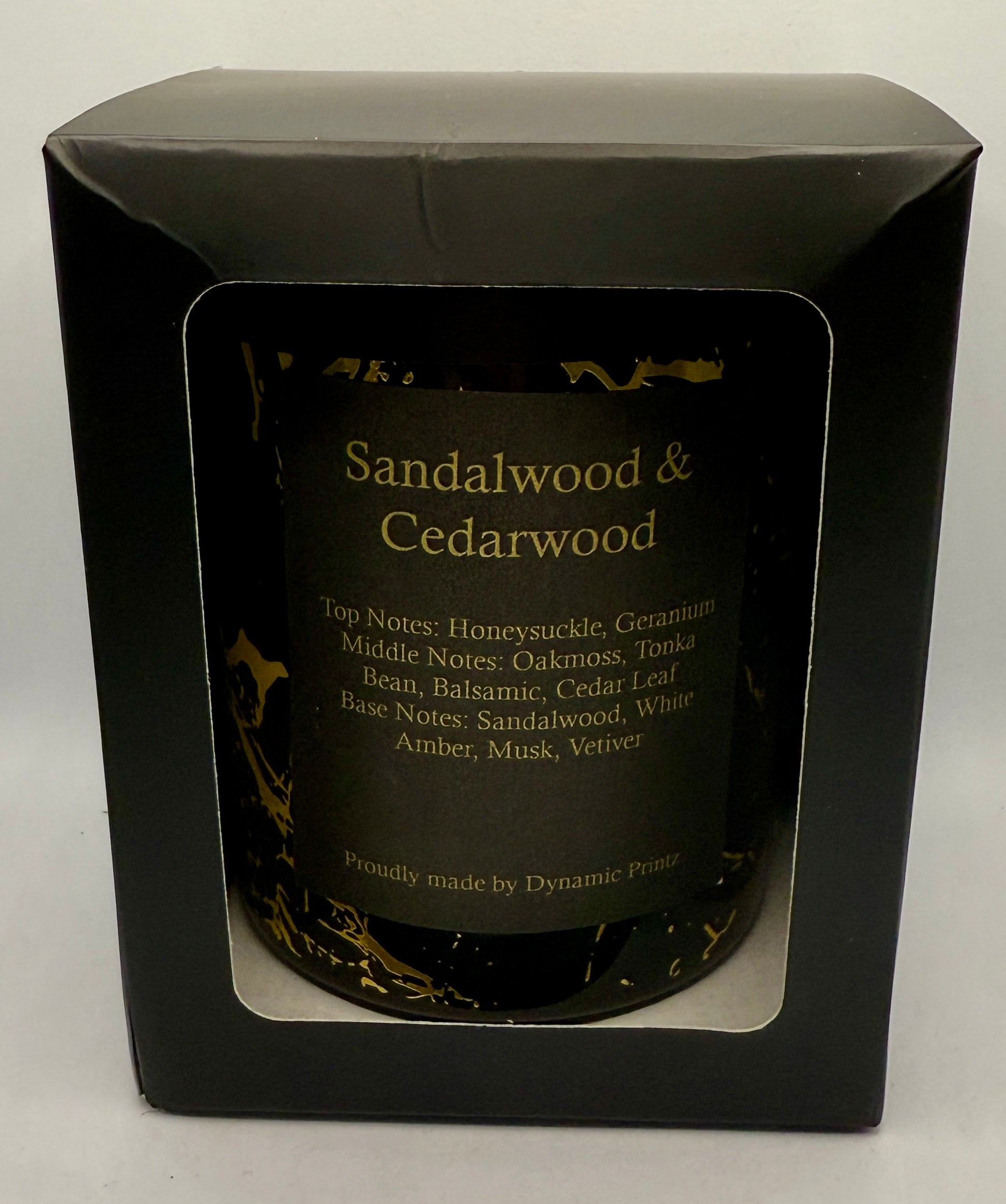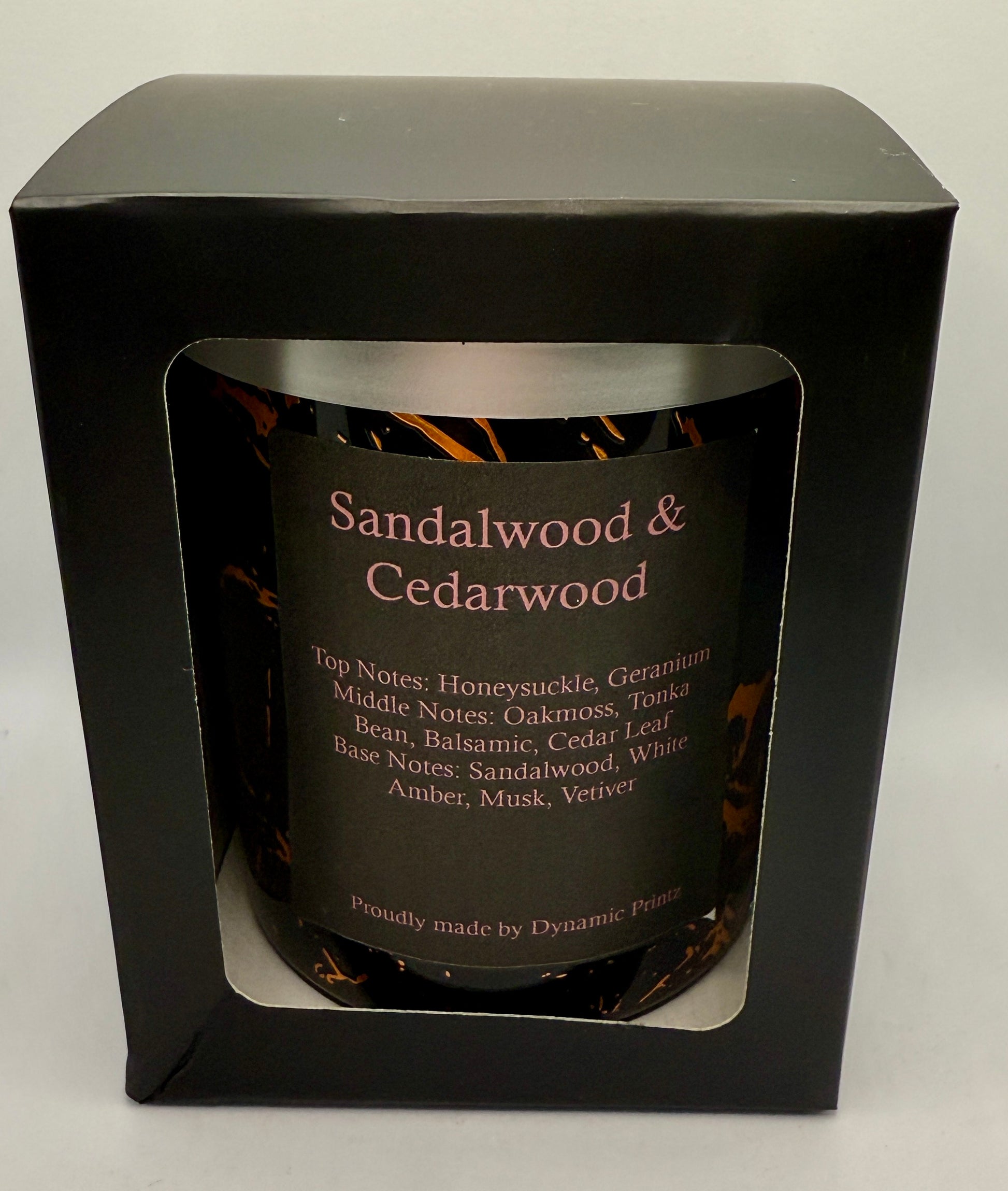 285g scented candle in a beautiful marbled jar. Unveil the allure of the Sandalwood & Cedarwood, a candle fragrance that embraces the captivating power of woody and musky scents. This fragrance is centred around the rich essence of sandalwood and cedar wood oils, exuding a warm and earthy heart, beautifully softened by delicate hints of violet and jasmine.