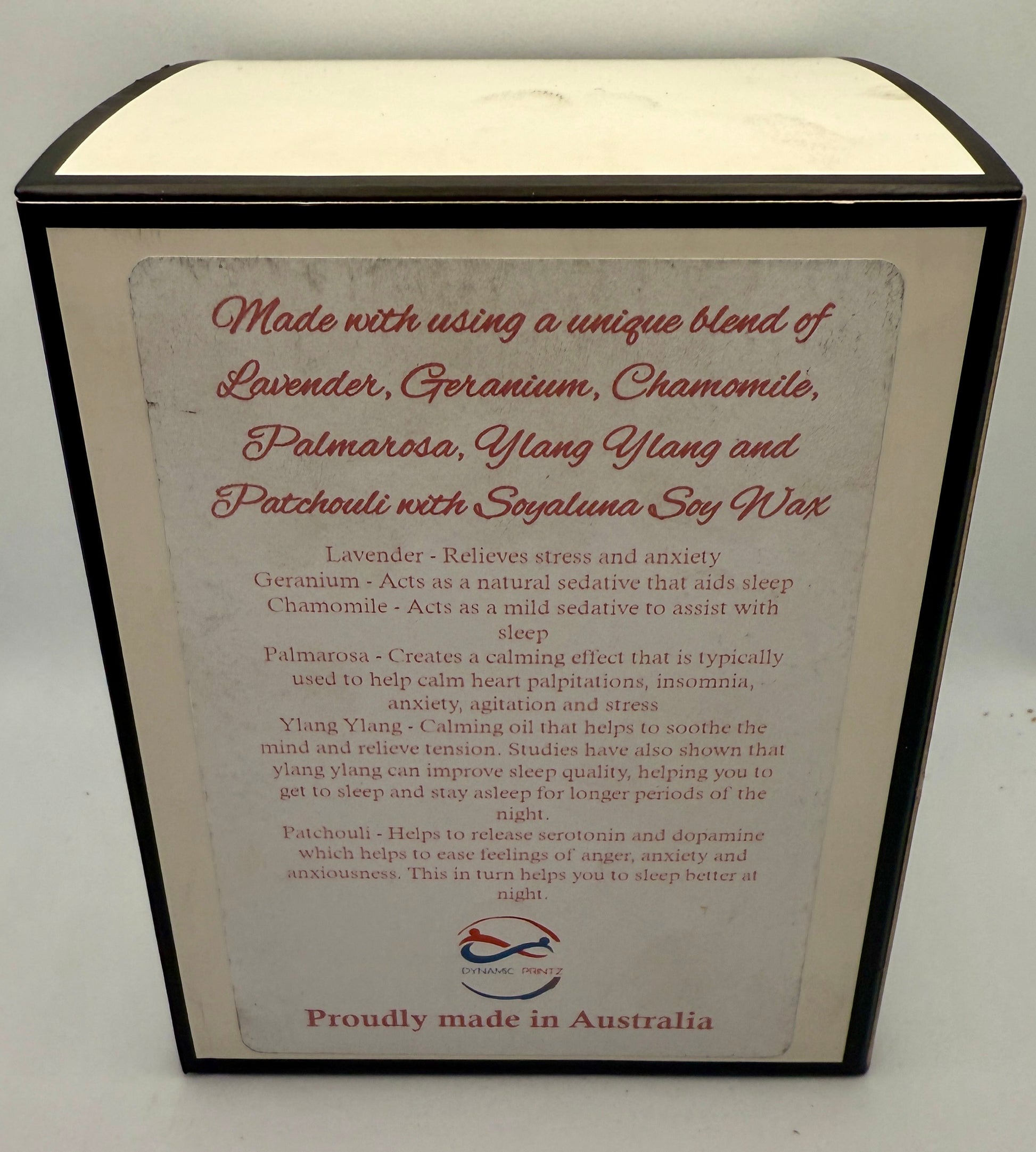 Scented candle with essential oils designed to promote sleep. Every oil in this blend helps to promote good sleep health by acting as a natural sedative or calming agent to settle the mind ready for sleep. Made with soy wax, this is a 100% soy candle with the perfect ratio of essential oils to create an aromatic effect without being overpowering. This product is perfect when you are winding down before bed and is available in a 285g double wick candle.