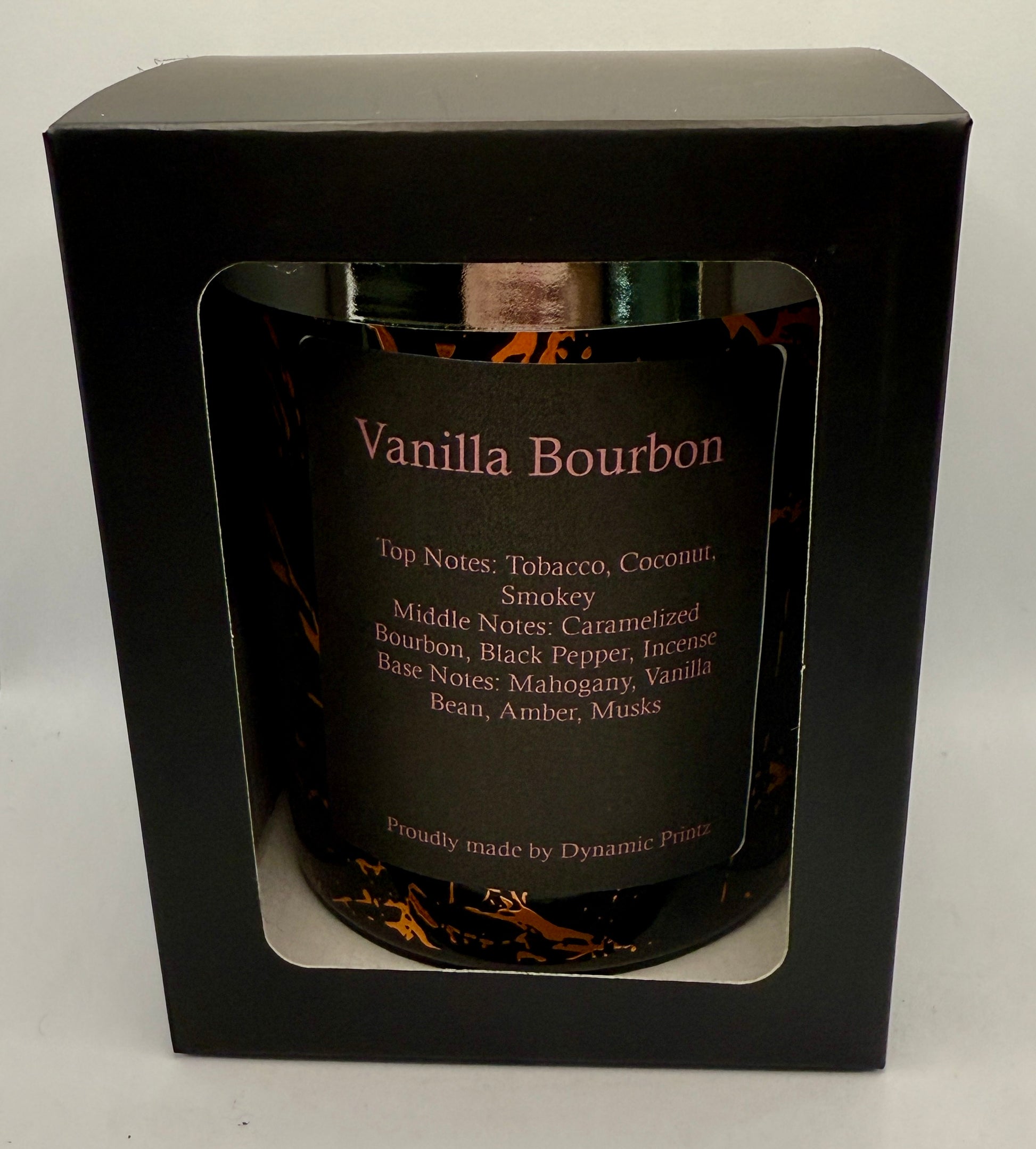 285g scented candle in a beautiful marbled jar. This is a candle fragrance that embraces a refined and sophisticated atmosphere, with a touch of intriguing smokiness. It is a scent that appeals to a wide range of tastes and preferences, capturing the essence of timeless elegance. Allow yourself to be immersed in the class and sophistication of "Vanilla Bourbon", as the air fills with the captivating blend of tobacco, coconut, smokiness, caramelized bourbon, black pepper, incense, mahogany, vanilla bean, amber, and musks.